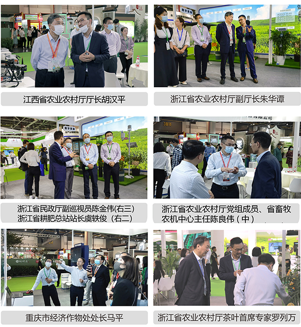 全國(guó)農(nóng)業(yè)技術(shù)推廣服務(wù)中心主任魏?jiǎn)⑽模ㄗ蠖?、園藝處處長(zhǎng)周澤宇(左一)、副處長(zhǎng)冷楊(右一)參觀托普云農(nóng)展位