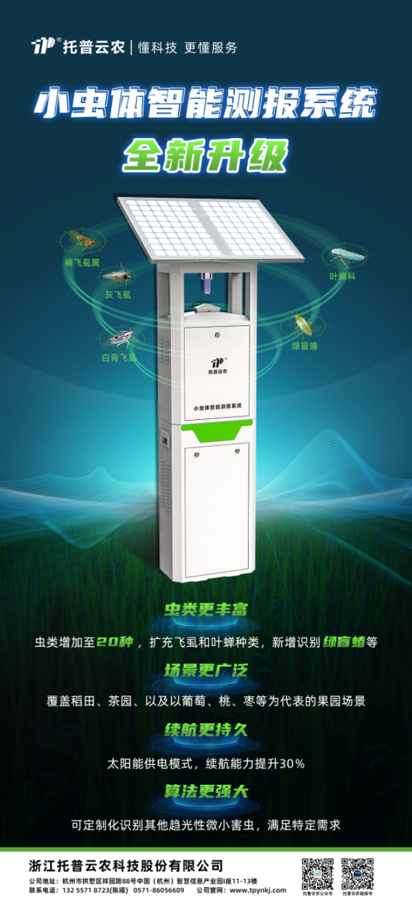 面對病蟲害肆虐的重發(fā)態(tài)勢,托普云農(nóng)從解決市場痛點發(fā)力,在不斷取得階段性成效的同時,進一步夯實小蟲體智能測報系統(tǒng)的硬件基礎(chǔ),全面優(yōu)化軟件內(nèi)核。針對水稻、茶園、果園病蟲害防控的市場需求,對稻飛虱和葉蟬進行了蟲類擴充,新增了為害果園的綠盲蝽。同時突破了原有的識別能力和應(yīng)用場景,使小蟲體智能測報系統(tǒng)迎來新一輪的全面升級,可識別蟲類擴充至包括稻飛虱、綠盲蝽、葉蟬等20種毫米級微小蟲體。此外,托普云農(nóng)進一步夯實硬件基礎(chǔ),采用太陽能供電模式、防雨設(shè)計,使續(xù)航能力有效提升30%,實現(xiàn)連續(xù)的陰雨天也可以正常捕蟲工作。